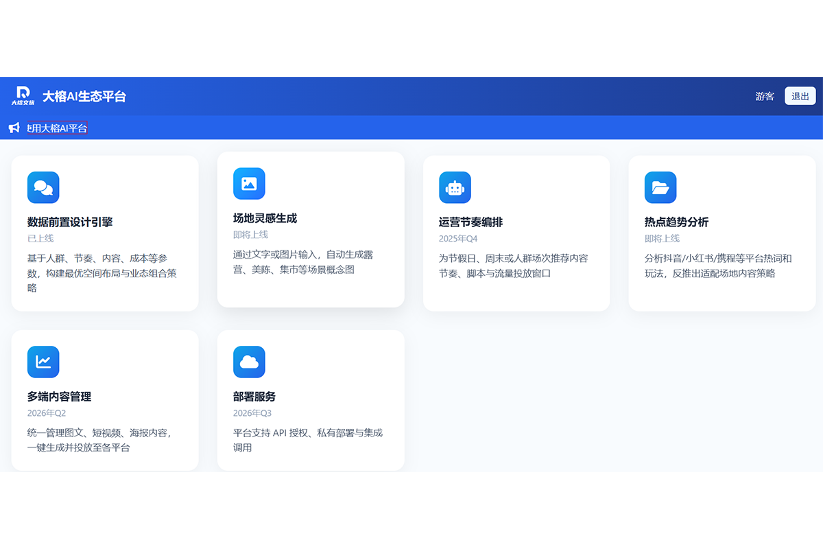 大榕AI每月开放 10 个【场地AI策划帮扶名额】,由 AI 系统联合设计师团队共同完成初步诊断、内容策划、空间建议和运营模型预演。通过 AI 高效提案 + 场地共创机制,帮扶优质场地在最短周期内明确方向、落地内容 !